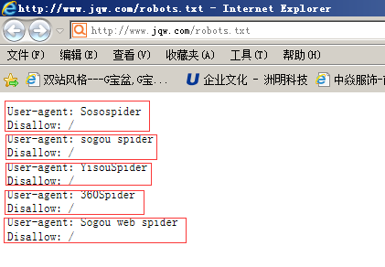二、我们再看看金泉网robots蜘蛛协议,robots地址:http://www.jqw.com/robots.txt 根据金泉网的蜘蛛协议发现,金泉网禁止搜搜、搜狗、宜搜、360搜索等蜘蛛的抓取,我并不知道金泉网为什么这么做,目前仅仅对百度搜索和google搜索开放抓取协议。