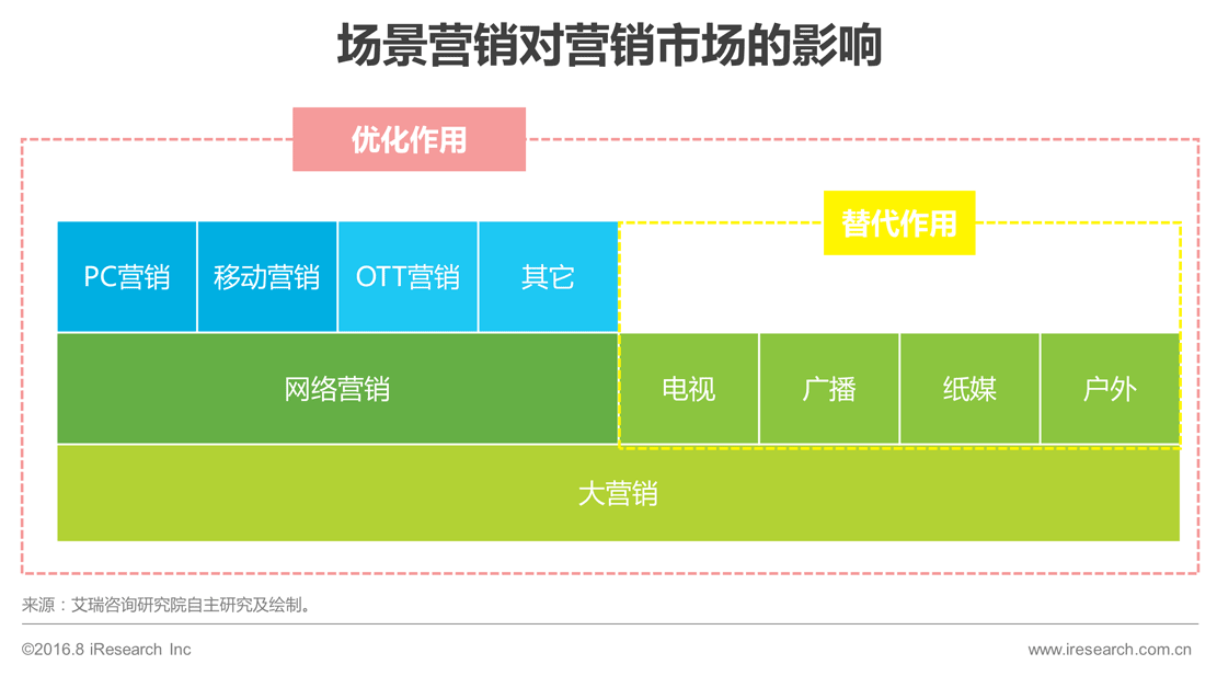 从整个营销市场上看,场景营销对原有营销市场有两种作用:优化作用和替代作用。对纸媒、广电、户外营销而言,场景营销既具有替代作用,同时也起到了优化效果。更多的营销行为不再通过传统传播媒介,因此替代作用更为凸显。场景营销对传统网络营销的优化作用集中体现在对场景这一营销维度的重视,使对用户的认识和理解更为全面。