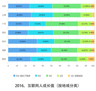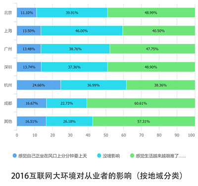 杭州的小伙伴对待互联网大环境态度最乐观。1/4的杭州互联网人“感觉自己正坐在风口上分分钟要上天”。而在同项调查中,只有11%的北京互联网人表达了同样的看法,是各大城市中比例最低的。