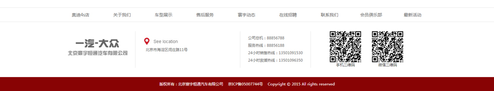 北京寰宇恒通汽车有限公司是一汽-大众奥迪品牌的特许经销商,是北京市一类维修企业。公司占地面积12000多平方米,其中新车展厅首层面积1800平方米、二手车展厅面积2500平方米,客户休息区800平方米。可以提供近100多个维修工位,室外停车位350个。公司位于西北四环外的闵庄路汽车大道,邻近玉泉山、香山和颐和园,交通便捷,是新老奥迪车主在海淀的家。