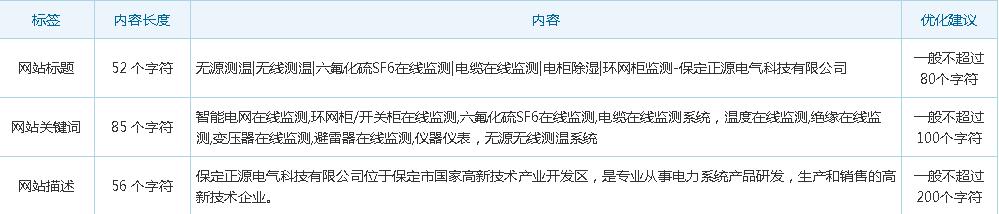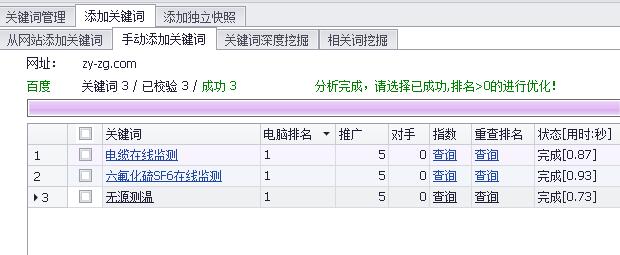 现在目标关键词:无源测温,六氟化硫SF6在线监测,电缆在线监测 排名在百度首页(因地区差异,排名有所差动);相信根据小编的优化方案进行优化,必定在不久的将来剩余的目标关键词《无线测温》也会逐渐出现在百度排名首页。